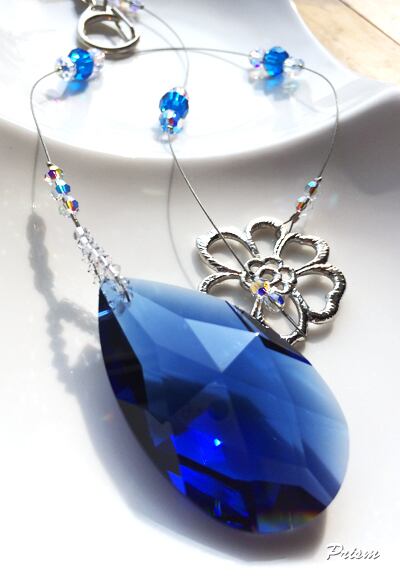 深みのあるダークサファイアのしずくに、フラワーモチーフが添えられた華やかな一本。50mmの大ぶりクリスタルが光を豊かに受け止め、部屋に青い光の粒を広げます。