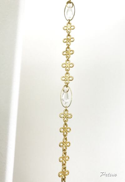 ラインの途中に配した七色のスワロフスキークリスタルも、ダリアの輝きに呼応してそれぞれ虹を放ちます。さらに上部にはチェーンパーツをあしらい、全体のゴージャス感をさらに引き立てました。